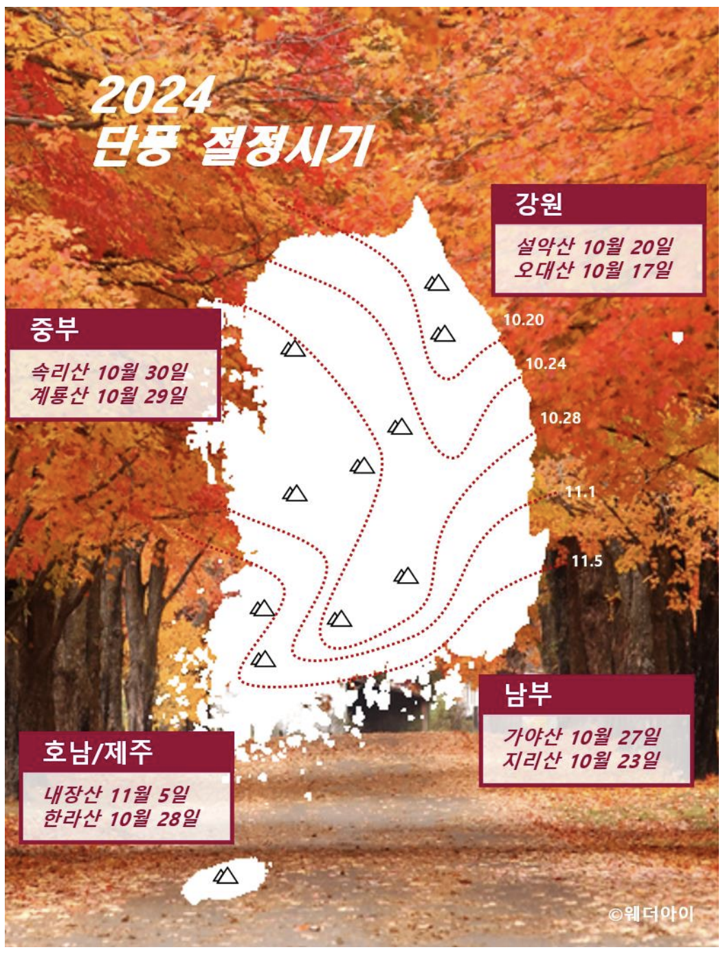 | # 2024년 가을 단풍 절정 시기: 놓치면 아쉬울 그 순간 (12) | 2024.10.09 |